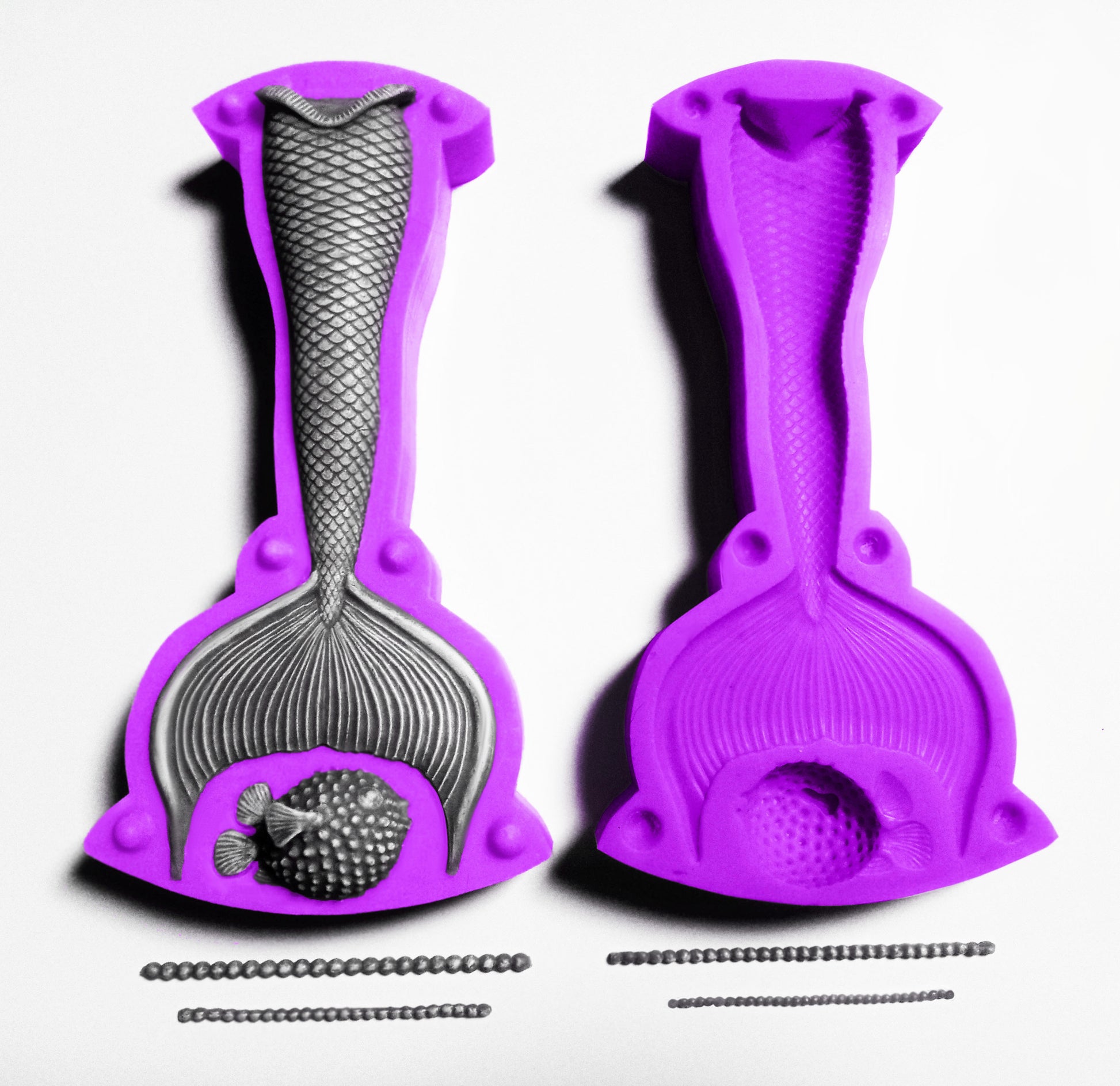 The Mermaid Tail mold fits perfectly with the Bella Body Mold. It is double-sided, allowing you to create a fully rounded tail section with defined scales and fins. The design includes a small pufferfish and fine strings of pearls.
